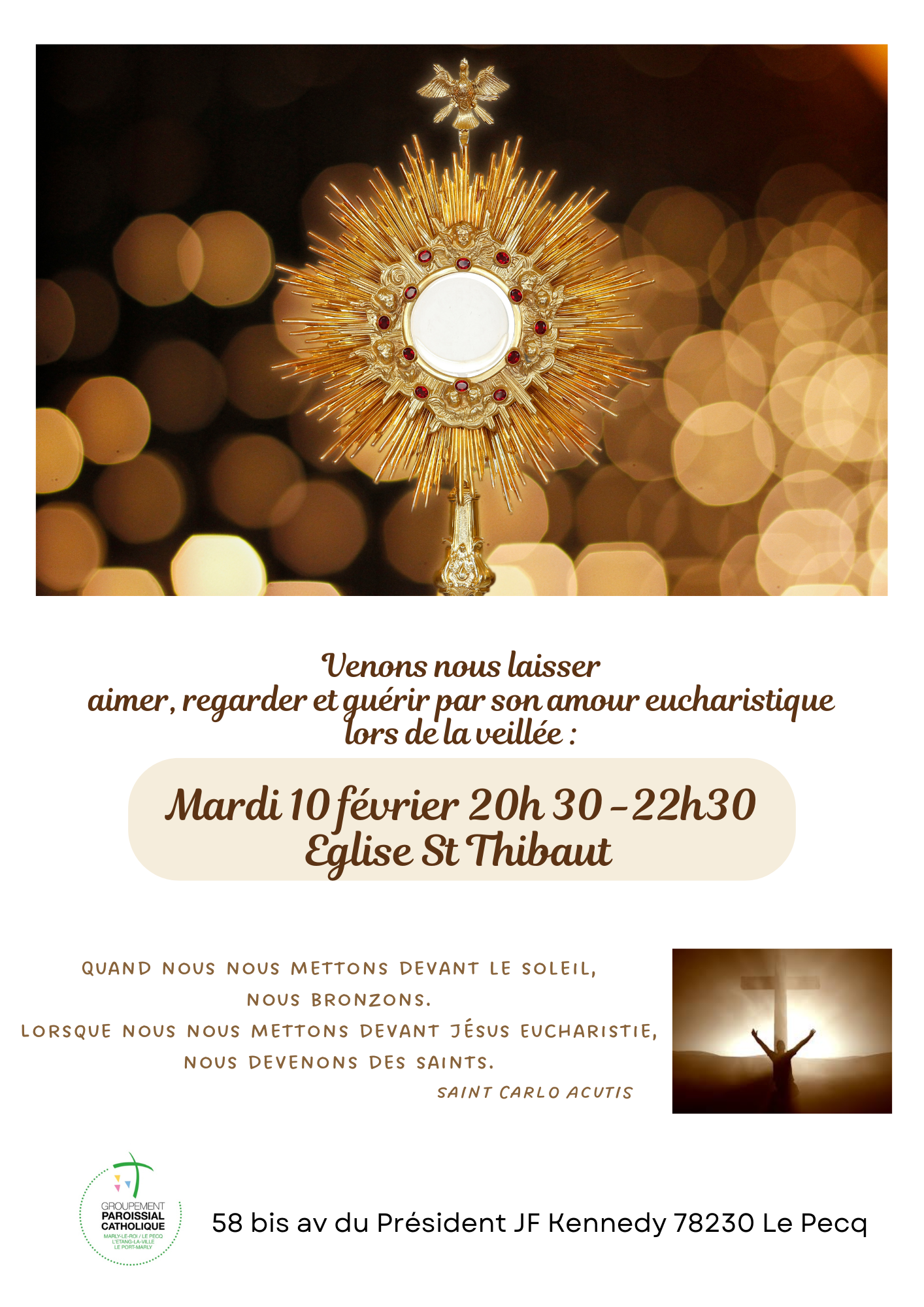 Pour fêter ces 10 ans d’adoration sur notre paroisse, plusieurs événements vont se succéder pendant lesquels nous nous mettrons sous la protection de Saint Carlo ACUTIS, lui qui a dit « l’Eucharistie, c’est l’autoroute du Ciel ». Qu’il nous accompagne tout au long de ces prochaines années.