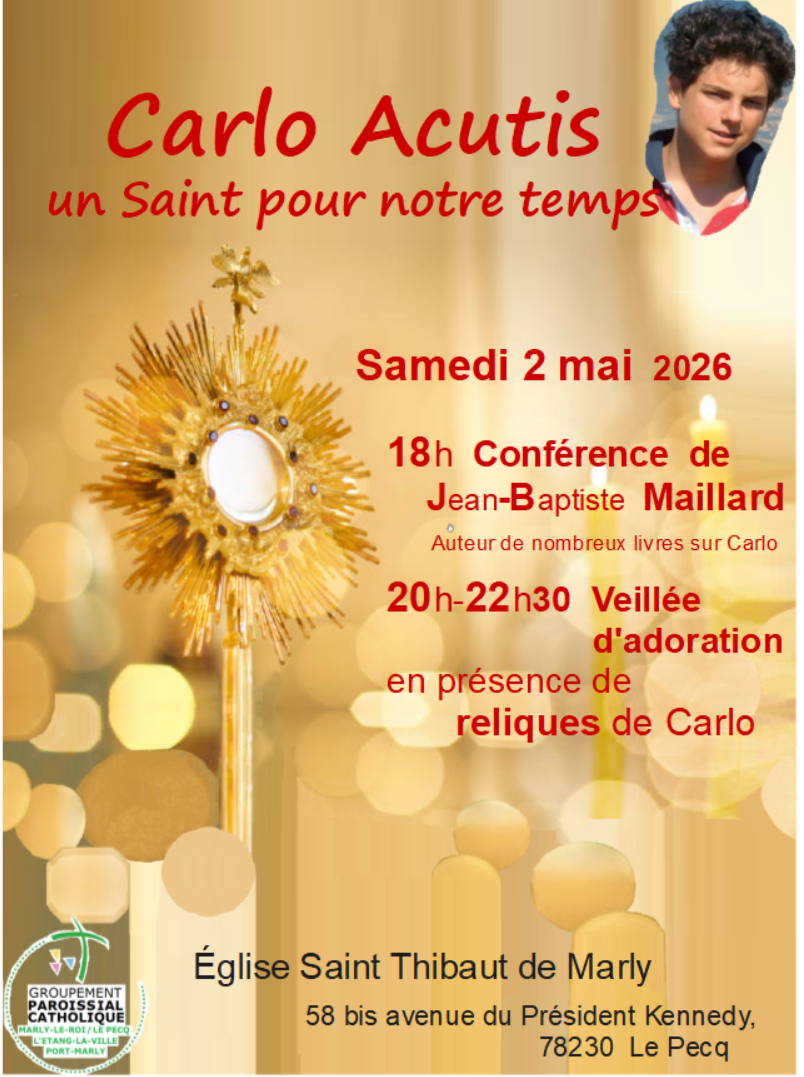 Samedi 2 mai à 18h à l’église St-Thibaut, conférence de Jean-Baptiste Maillard, auteur de nombreux livres sur Saint Carlo Acutis ;
